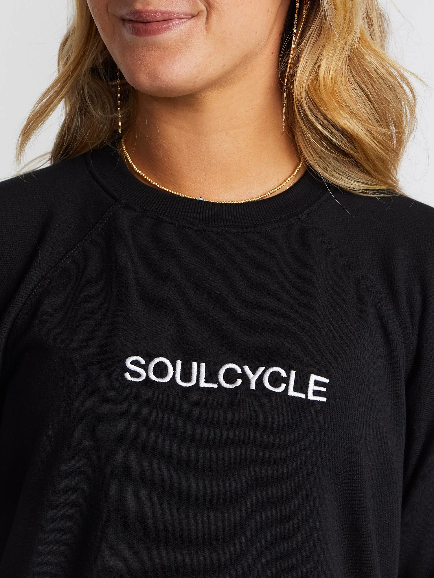 Meet your new favorite super soft sweatshirt for pre class warmups and post class cool downs. Designed with a vintage collegiate fit, sporty raglan sleeves, ribbed cuffs and hem. Features white embroidered “SOULCYCLE” on the front.