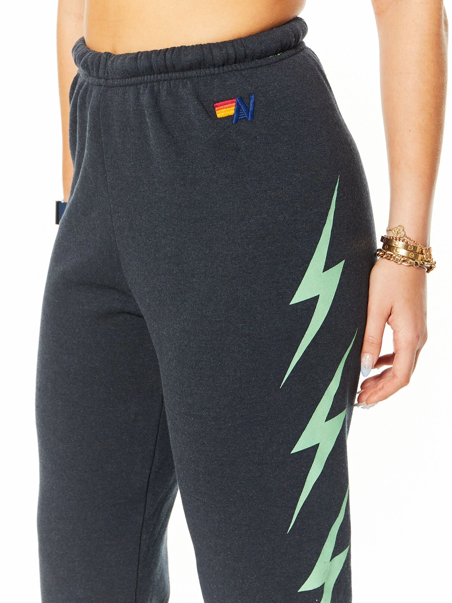 Kick back and relax in these vintage-inspired sweatpants by Aviator Nation. These sweats are designed with a special break-down process to create lived-in softness from the very first wear. Hand sewn using single needle stitch work. Features 4 lightning bolts down left leg. Made in L.A.