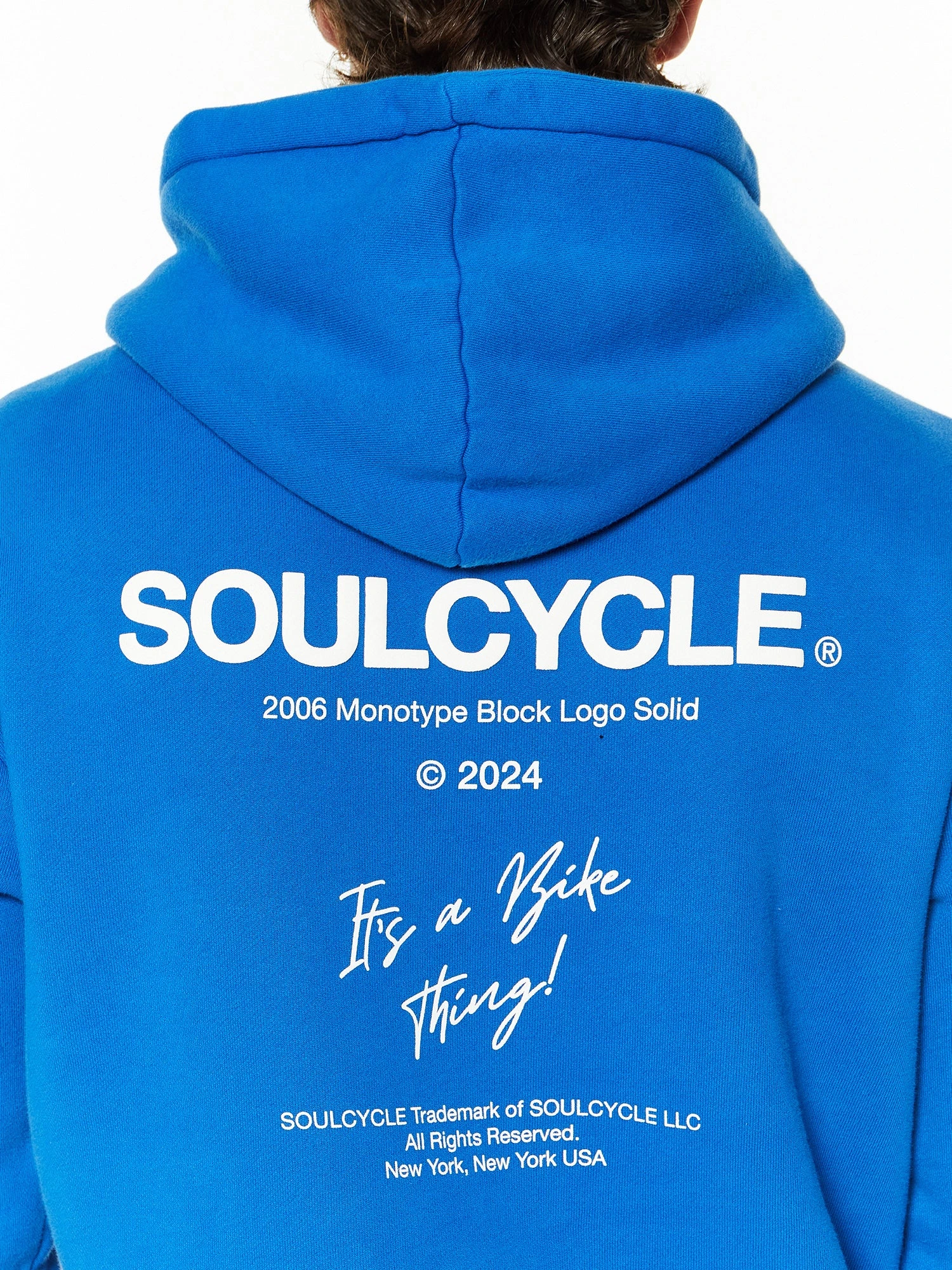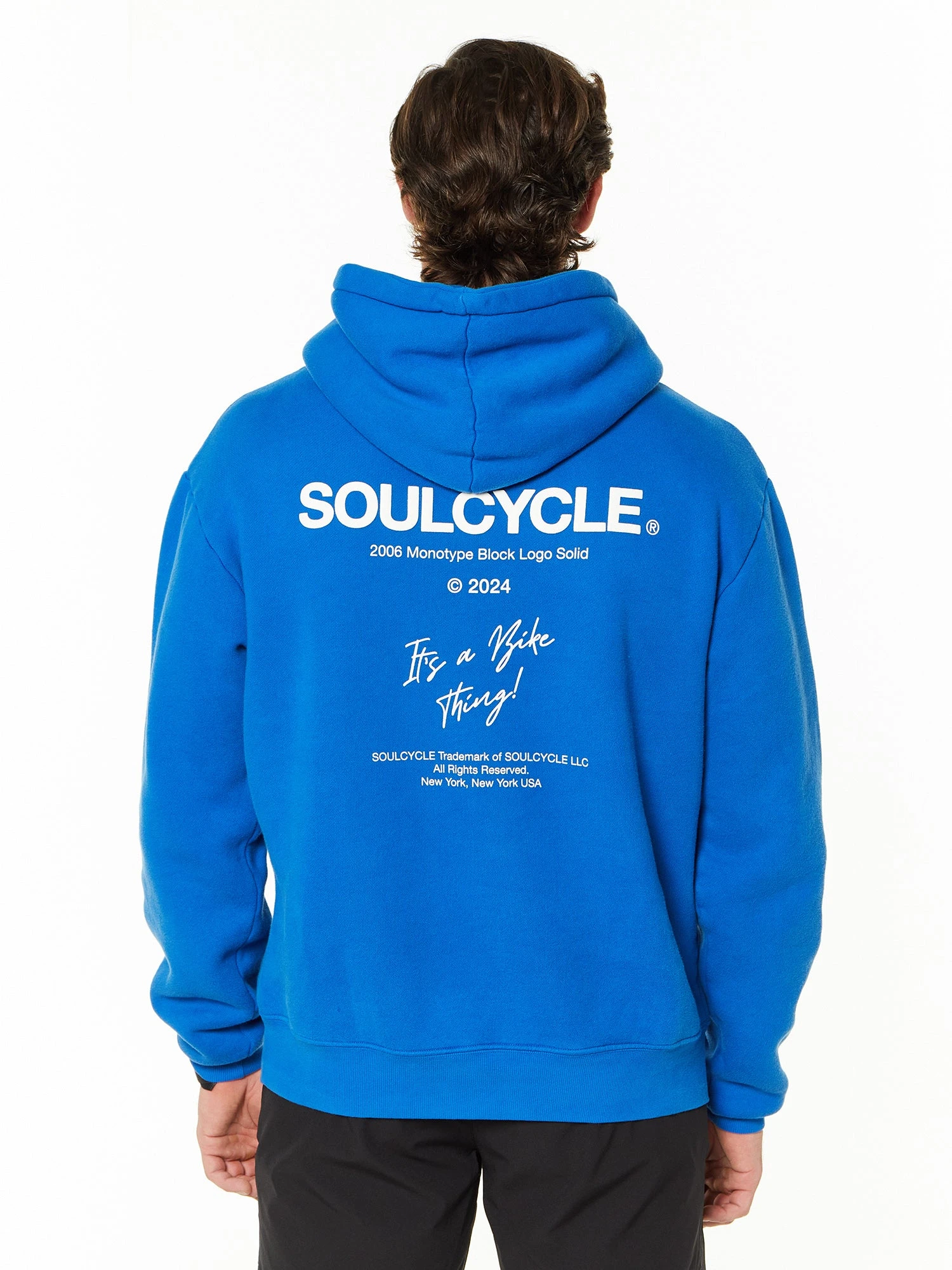 Meet your new favorite post-class layer. This unisex hoodie has an oversized fit with a roomy hood and front kangaroo pocket. Features “IT’S A BIKE THING” on the front left chest and a large “SOULCYCLE. IT’S A BIKE THING” graphic on the back in white. Made in LA.