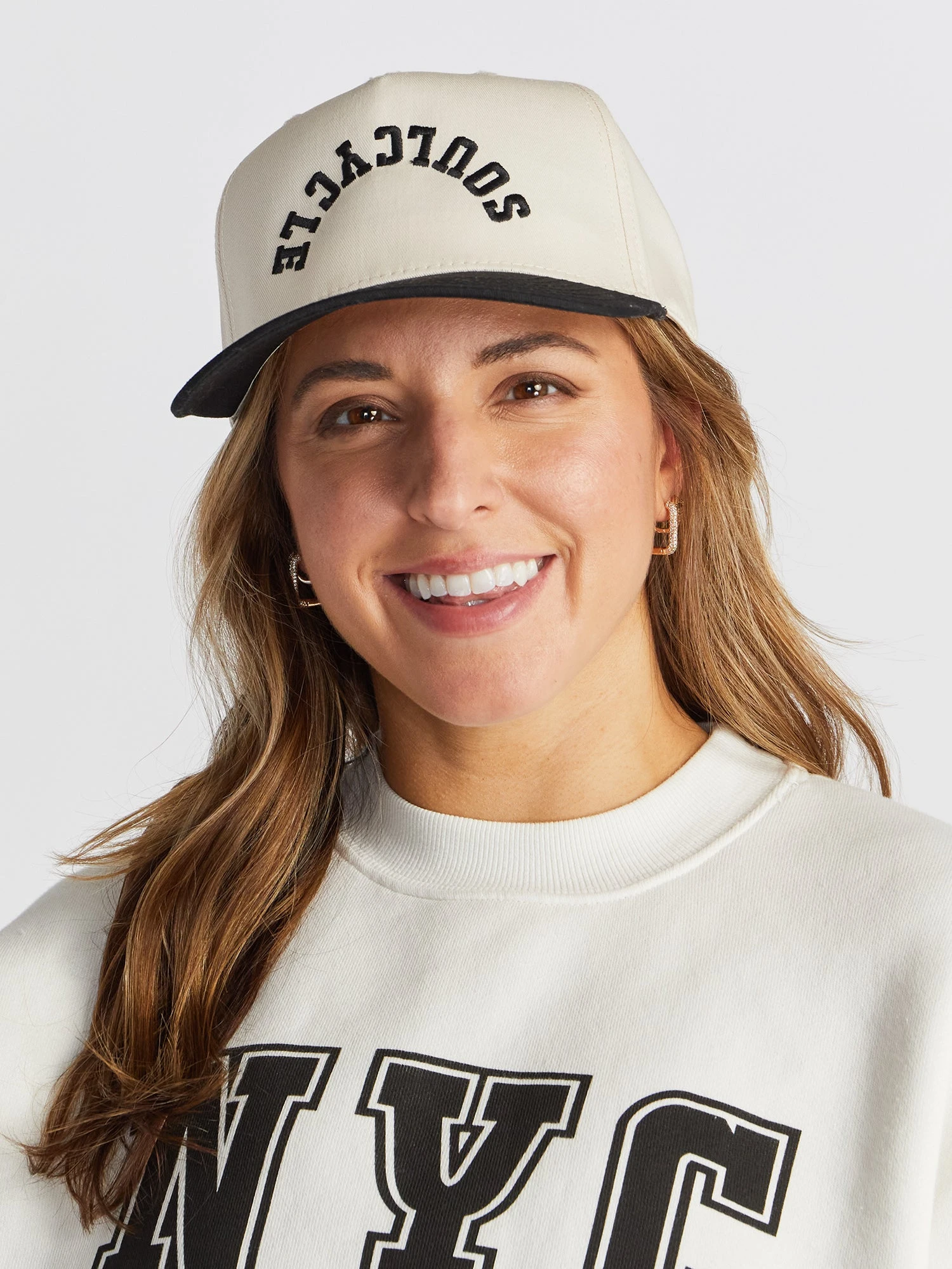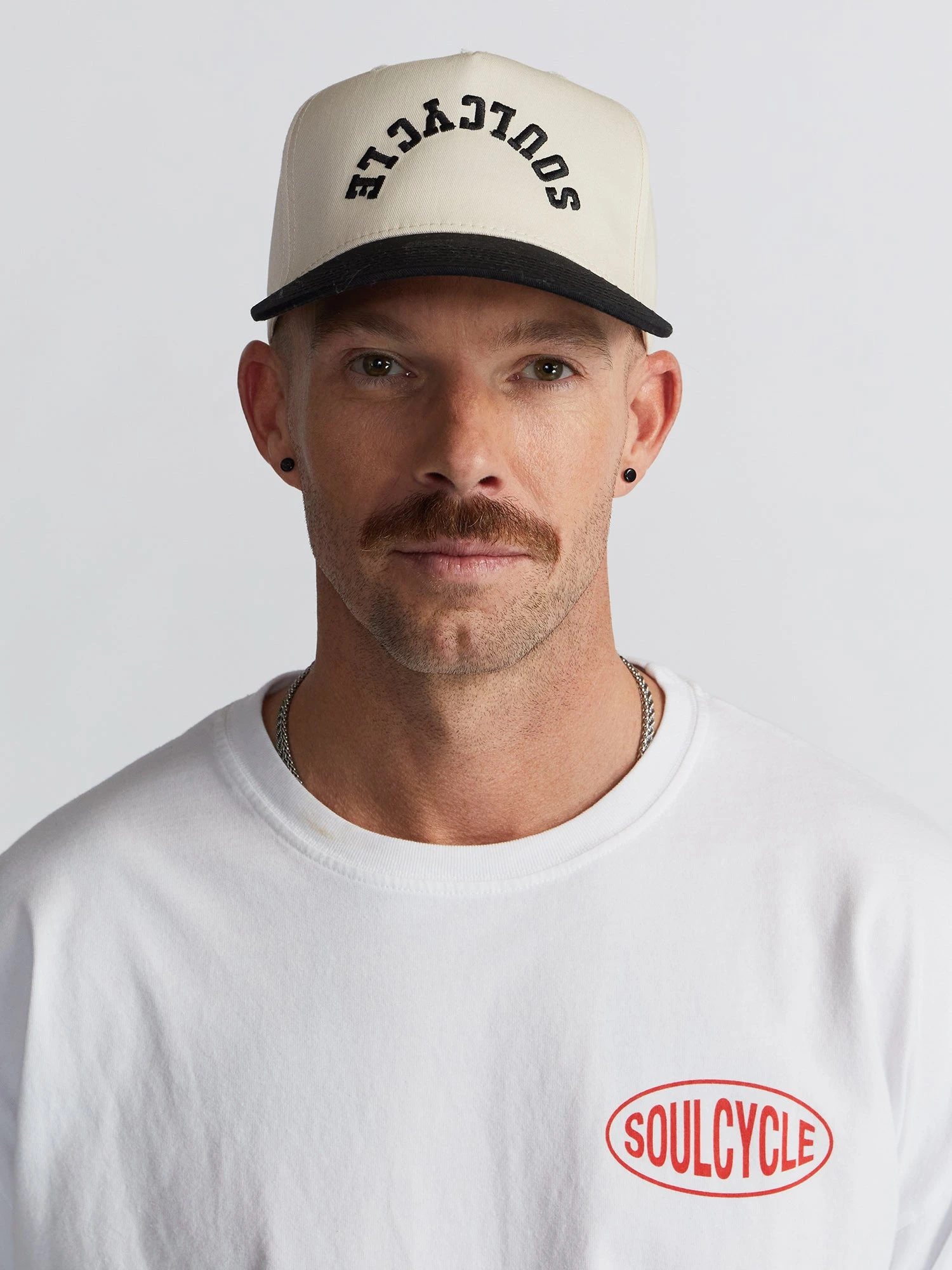 This trucker hat is your new daily, all-season staple. It features an adjustable closure and an upside-down “SOULCYCLE” graphic in black, paired with a black brim.