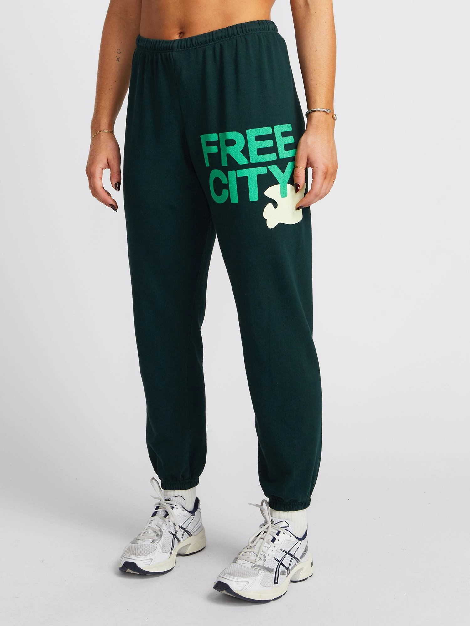 This unisex sweatpant is hand-sewn and hand-screen printed locally in Los Angeles for an 100% custom garment. Designed in a relaxed fit with covered elastic waistband and pull drawcord. Features FREECITY print with a dove on left thigh. Made in U.S.A.