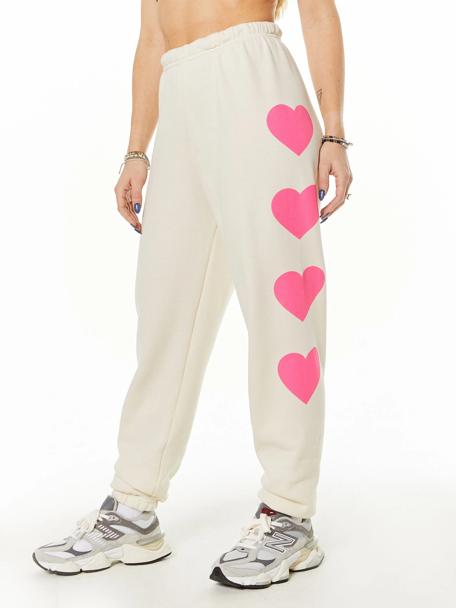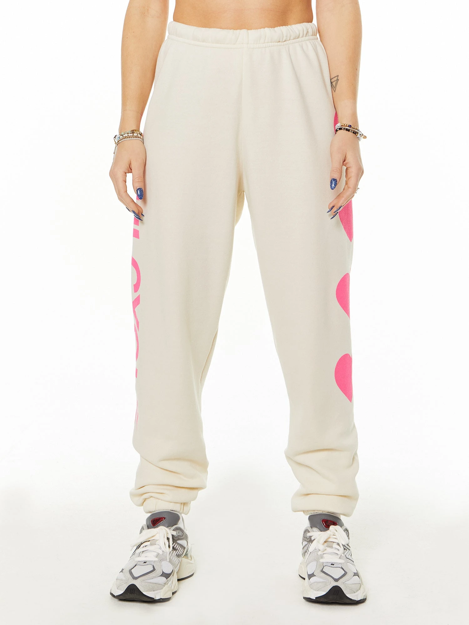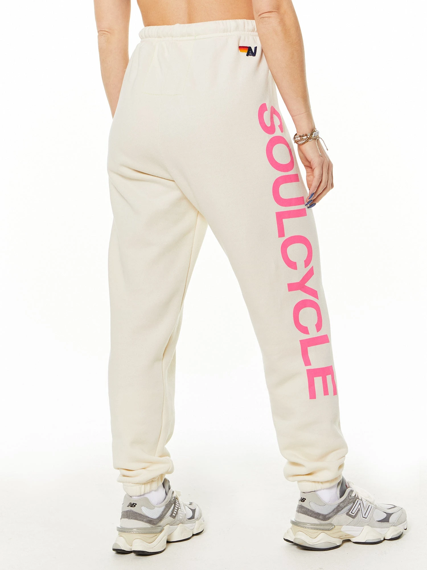 This classic vintage-inspired sweatpant by Aviator Nation goes through a special break-down process to create the feel of lived-in softness from the first wear. Features four hearts and “SOULCYCLE” in pink down each leg. Hand sewn using single needle stitch work in the heart of Los Angeles.