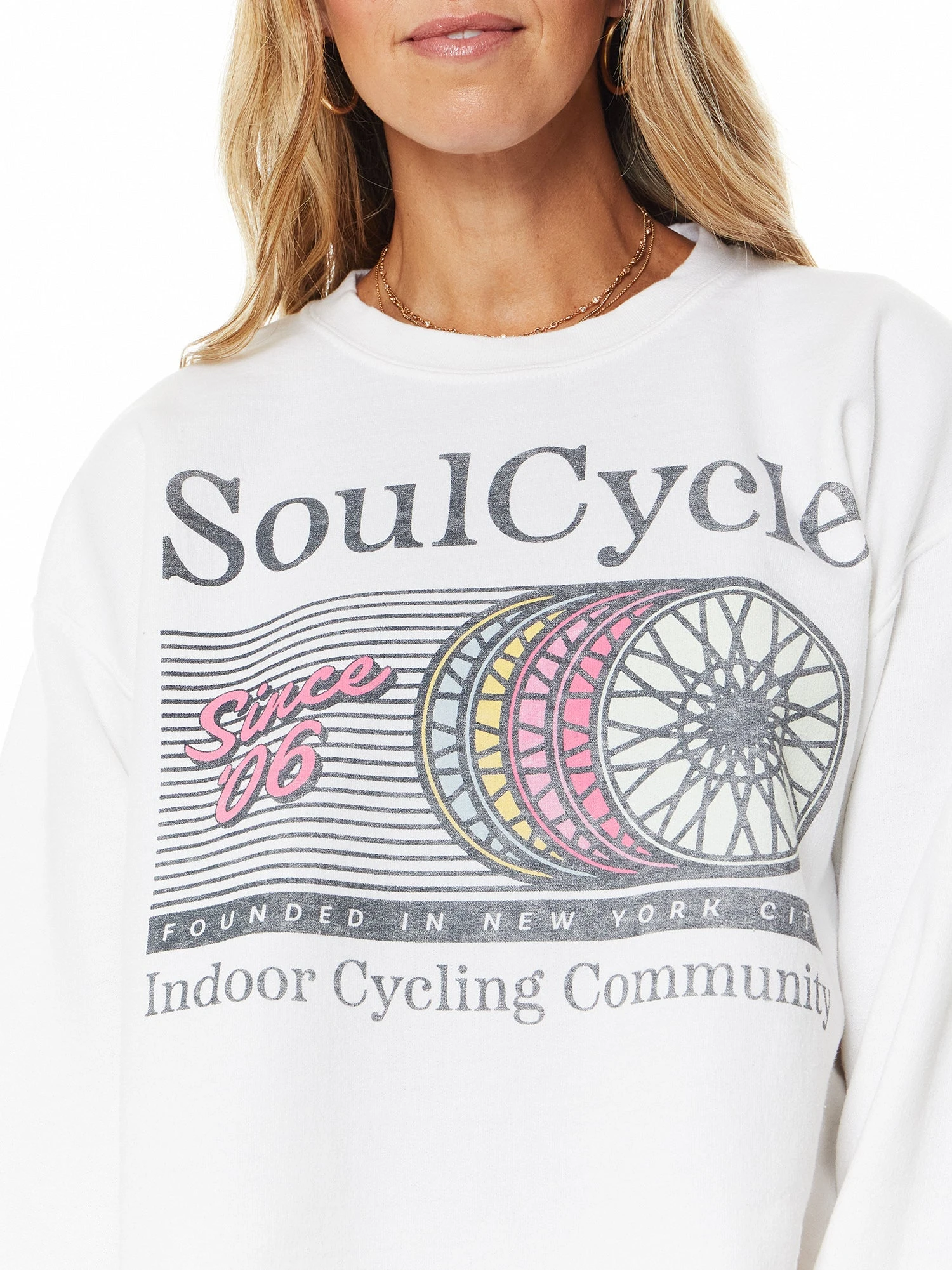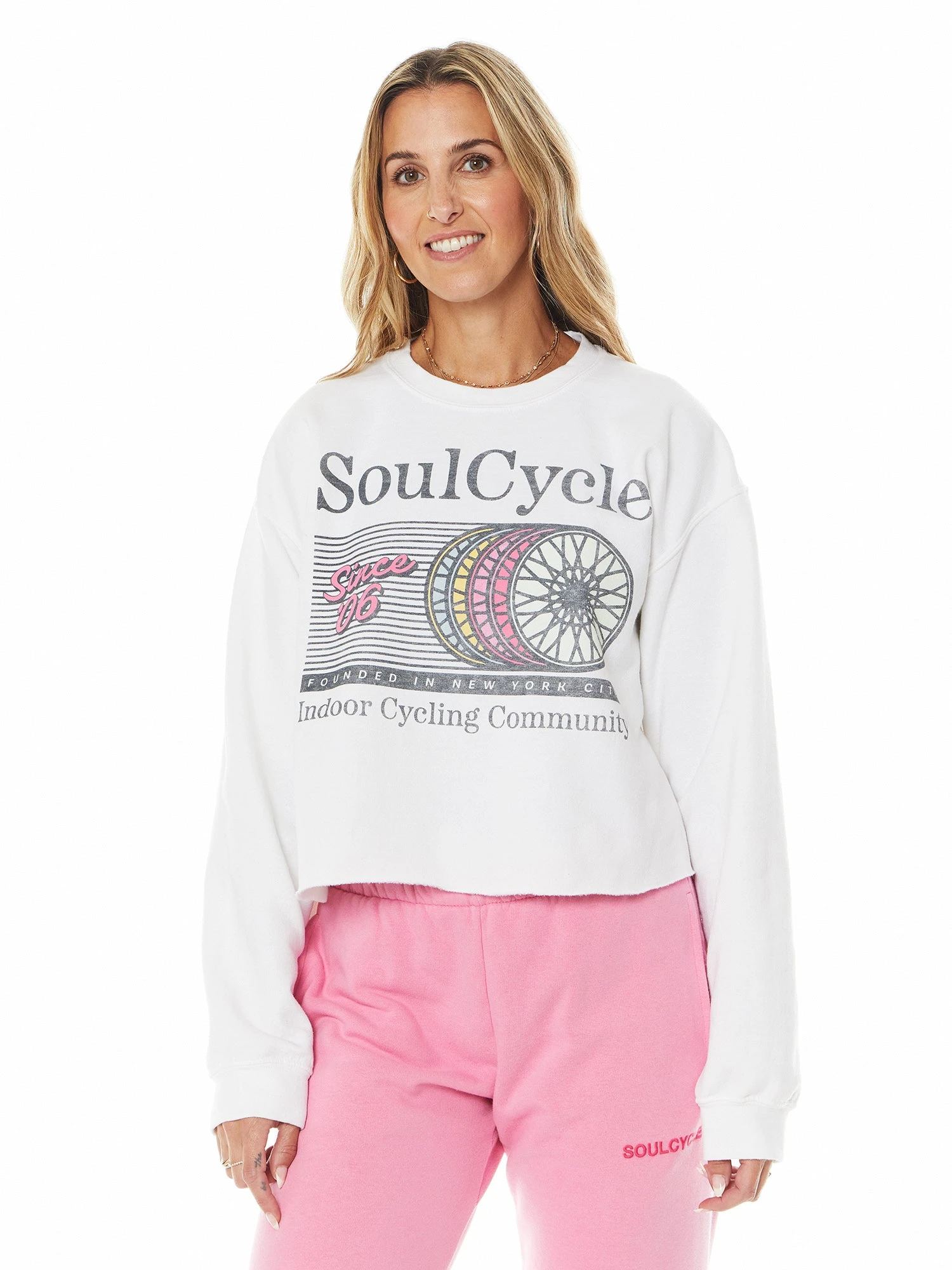 Meet the perfect layering peice of your dreams. This cropped, oversized top, is the long-sleeve version of our timeless Emily tee. Pair it with your favorite favorite leggings, sweatpants or jeans for an effortlessly stylish look. Features “SOULCYCLE INDOOR CYCLING COMMUNITY” in grey across the center front and 4 multicolored wheels. Made in L.A.