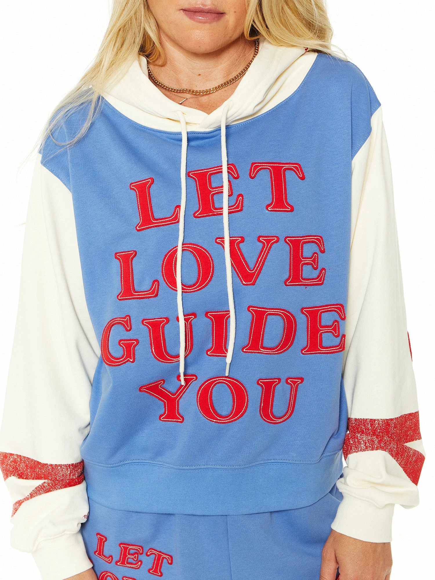 Meet your new statement hoodie for cozy days. Designed with a cropped fit and super soft cotton so you can lounge in comfort. Features vintage distressed, red stripe detailing on the arms, “MAYFAIR” embroidered on thel left side of the hood, “YOU DESERVE GOOD THINGS” screenprinted in red on the right wrist, and a large “LET LOVE YOU GUIDE YOU” in a red applique with pearl color embroidery.