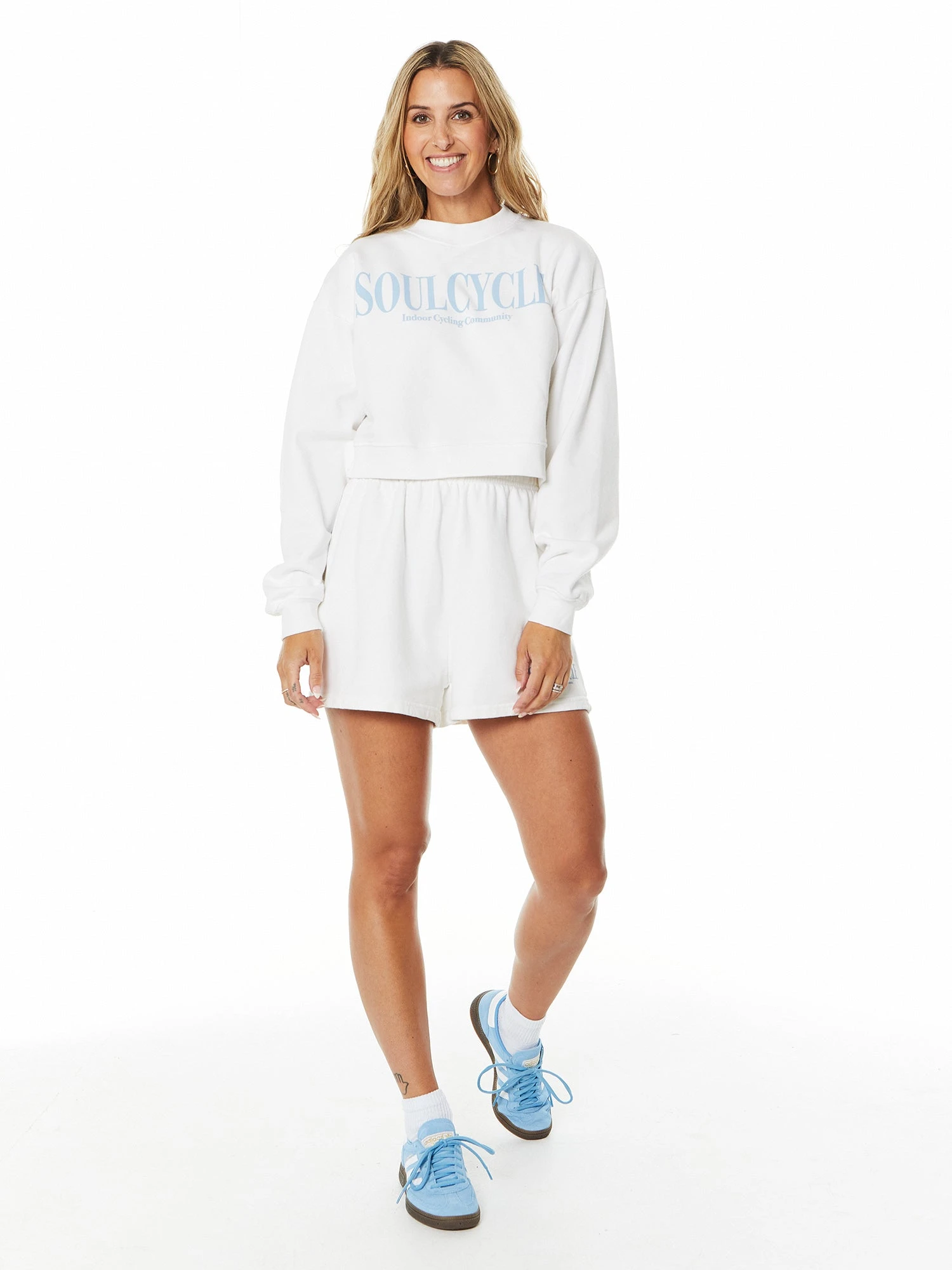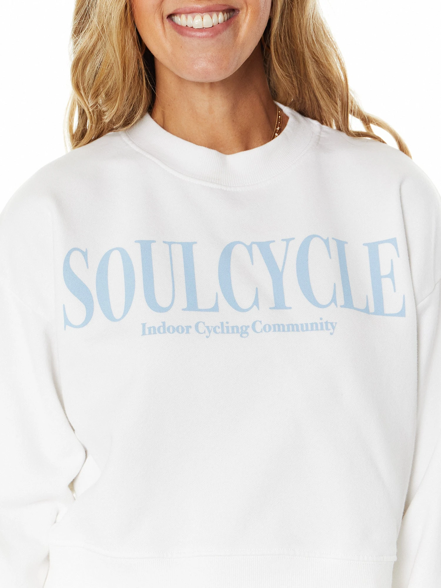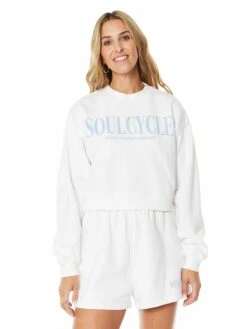 Cropped, comfy and designed with a crewneck for warming up and layering in style from the studio to the street. Features multicolored “SOULCYCLE” in blue on the center front. Made in L.A.