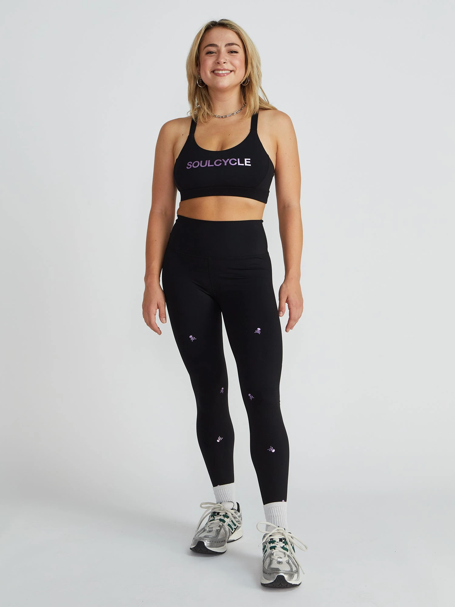 This bra is designed with the ride in mind. With a soft scoop-neck and thin straps, this is the perfect medium support bra for sweating, dancing, and riding to the rhythm. Features “SOULCYCLE” in foil across center chest.