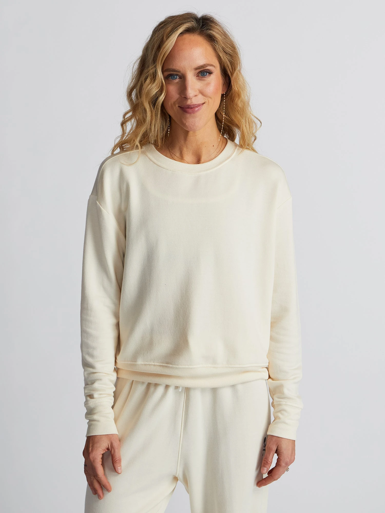This classic sport-inspired crewneck pullover is soft, versatile, and ultra-flattering. Made with ultra-luxe fleece, it features dropped sleeves, ribbed hem, and sleeve cuffs for a perfect finish. Worn by Karyn from NYC.