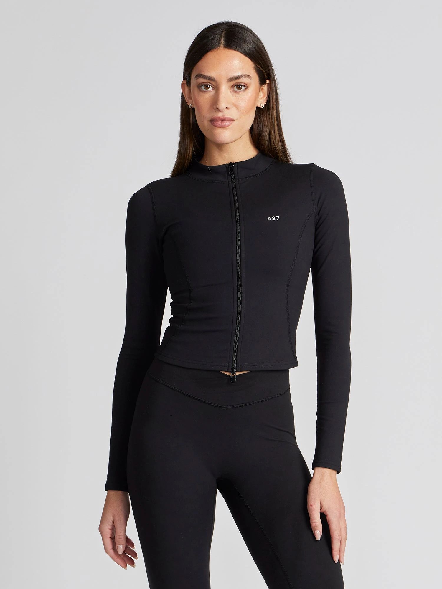 A fitted, long-sleeve active jacket with a waist-elongating cut. Featuring a mock neck, flattering seams, and an hourglass shape. Made from double-layered, moisture-wicking 437 Cloudâ„¢ fabric for full coverage.