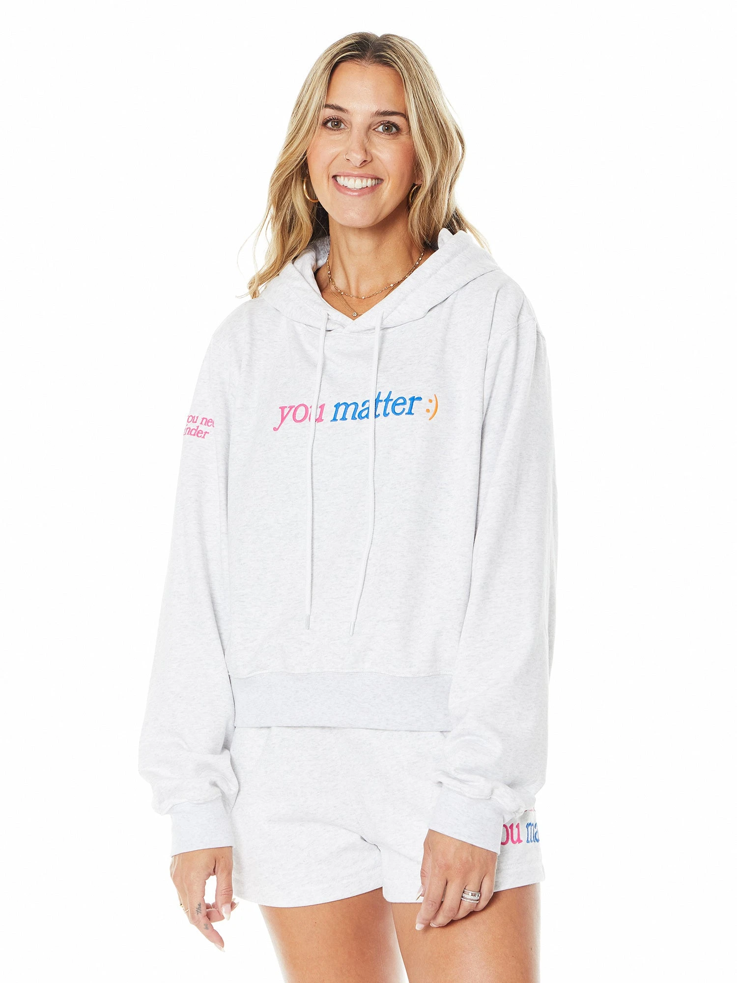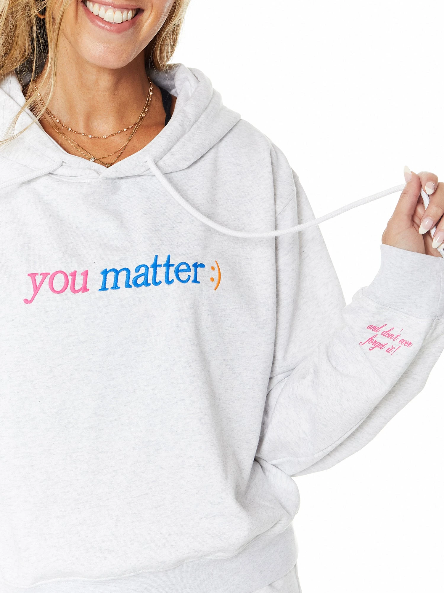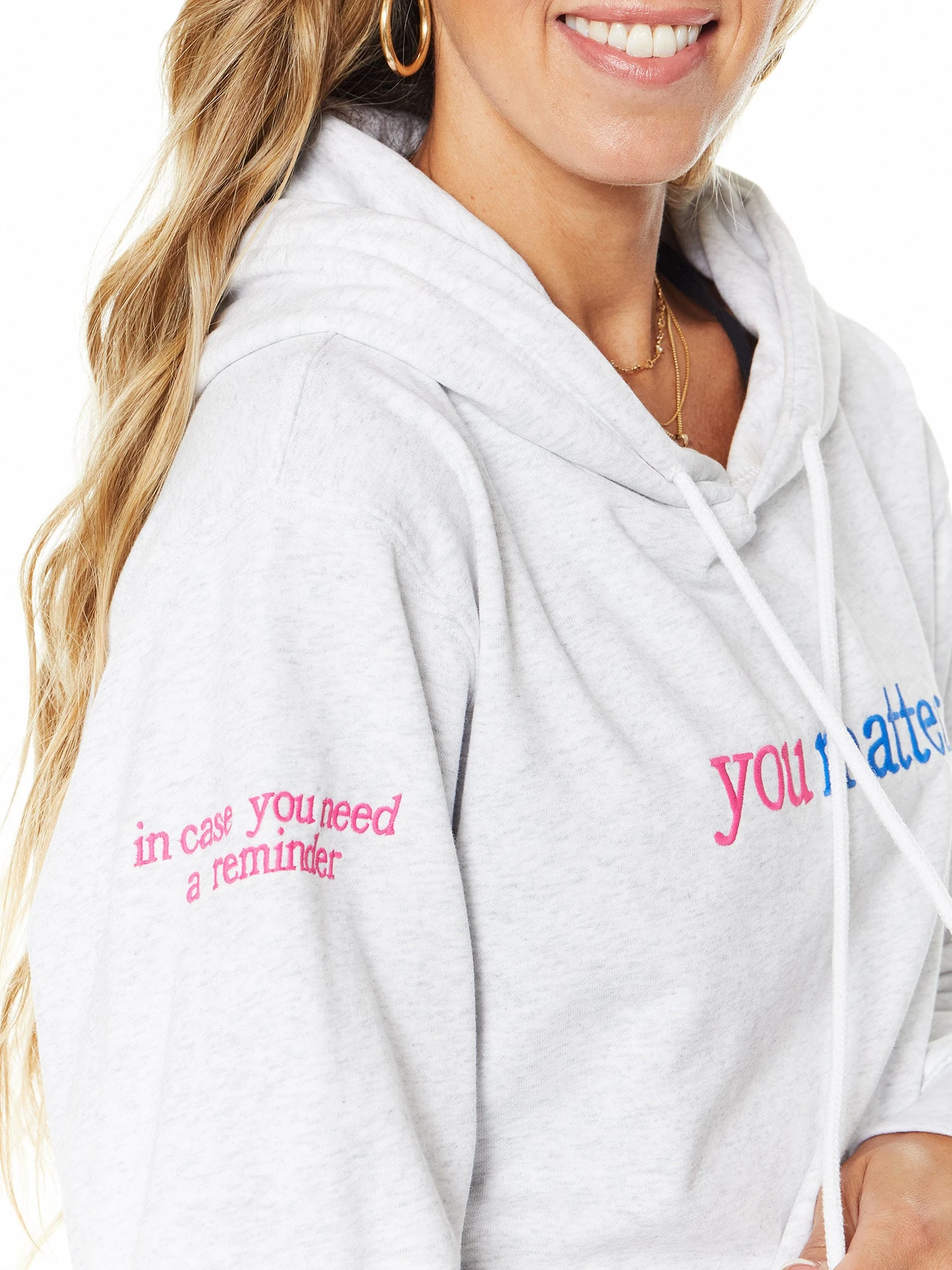 This cozy, cropped hoodie is the perfect addition to your closet for year round comfort. Features ‘You Matter” embroidered in pink, blue, and orange across chest, “Mayfair” embroidered on the mid-back. “In case you need a reminder” screenprinted in pink on the right bicep, and “And don’t you forget it!” screenprinted in pink on the left wrist.